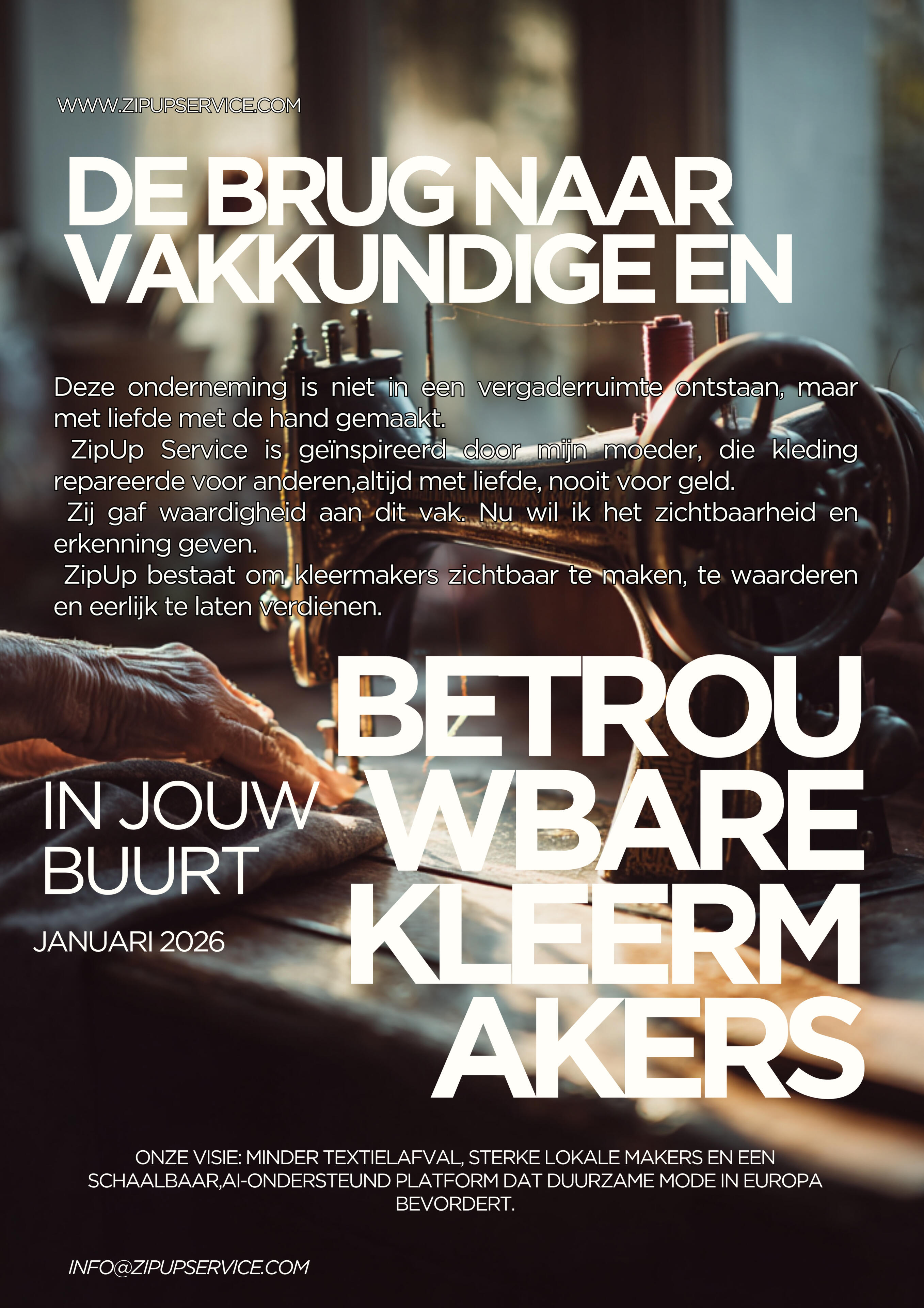 We bring together talented tailors, makers, and customers who value quality, creativity, and local craftsmanship. From small clothing repairs to custom-made pieces, Zip Up makes it simple to connect, collaborate, and keep clothing in circulation.